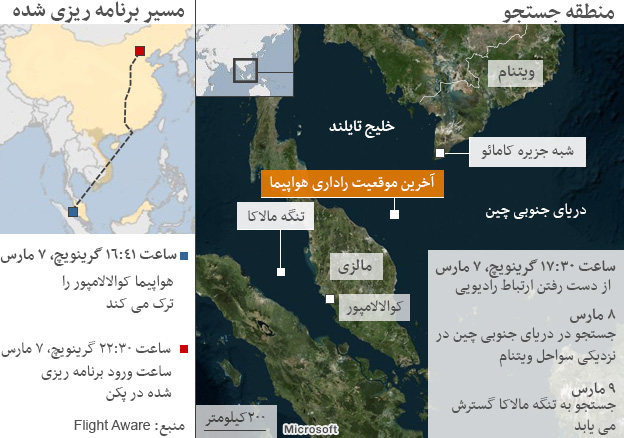 هواپیمای مالزیایی ۵ روز پیش و ساعاتی پس از پرواز از این کشور به مقصد چین از صفحه رادار محو شد. از آن زمان تاکنون جستجوها برای یافتن این هواپیما نتیجهای نداشته است.