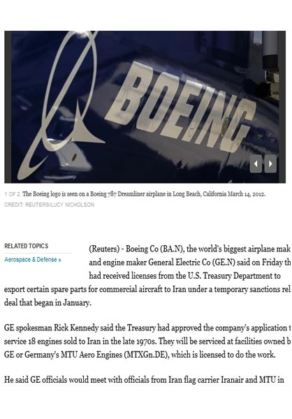 در پایان ماه فوریه، «جنرال الکتریک» دیگر شرکت معروف امریکایی اعلام کرد که برای فروش قطعات یدکی هواپیما به ایران از مقامات این کشور درخواست مجوز کرده اما تاکنون پاسخی دریافت نکرده است.