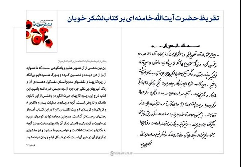 رهبر معظم انقلاب در تقریظی که بر این کتاب مرقوم فرمودهاند، میفرمایند: «این نیز بخشی از آن تصویر عظیم و باشکوهی است که ما همواره آن را از دور دیده و تحسین کرده و بزرگ شمردهایم بیآنکه از ریزهکاریها و نقشهای معجزهآسای تشکیل دهنده آن و رنگ آمیزیهای بینظیر جزء جزء آن، به درستی خبر داشته باشیم. این کتاب شرح این ریزهکاریهای حیرت انگیز در بخشی از این تابلوی ماندگار و تاریخی است. آنچه درباره عملیات بدر و والفجر 8 و کربلای 5 و کربلای 4 و بیت المقدس 2 و 3 در این کتاب آمده از بخشهای برجستهتر آن است. همچنین مجاهدتها در کوههای غرب؛ در ماووت و گردهوش و قامیش دیگر آن بلندیهای سخت، و نیز آنچه به یگانها و دستجات اطلاعات و غواص مربوط میشود و نیز بخشهای دیگری از آن در خور آن است که در شکل فیلم و رمان عرضه شود.»