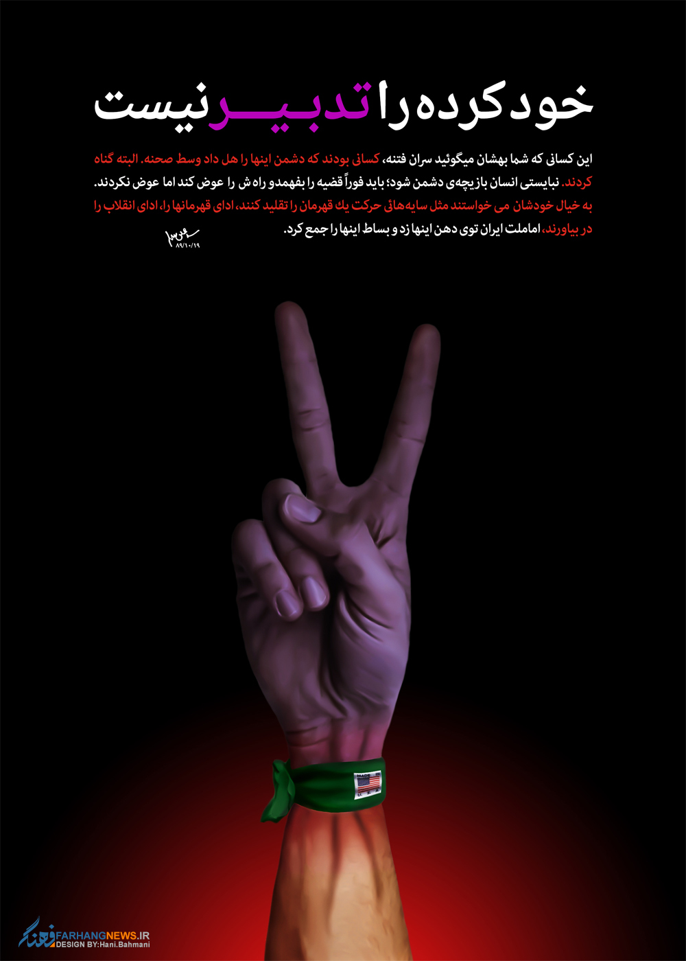 شهدای ایران: این کسانی که شما بهشان میگویید سران فتنه، کسانی بودند که دشمن اینها را هل داد وسط صحنه. البته گناه کردند. نبایستی انسان بازیچه دشمن شود؛ باید فورا قضیه را بفهمد و راه اش را عوض کند اما عوض نکردند. به خیال خودشان می خواستند مثل سایی هایی حرکت یک قهرمان را تقلید کنند، ادای قهرمانها را، ادای انقلاب را دربیاورند، اما ملت ایران توی دهن اینها زد و بساط اینها را جمع کرد. (مقام معظم رهبری ۱۹/۱۰/۸۹)
