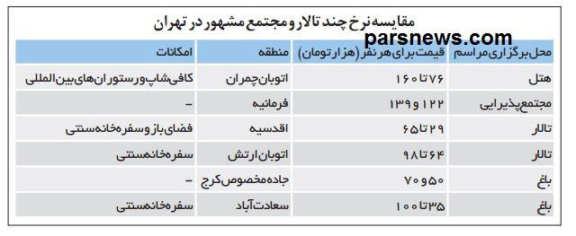 منطقه یک تهران خیابان فرمانیه میزبان یکی از مجتمعهای پذیرایی ورزشی است که بسیاری از ثروتمندان تهرانی و افراد مشهور این مکان را برای مراسم غم و شادی خود انتخاب میکنند. این مجتمع پذیرایی که به نسبت دیگر هتلهای لوکس امکانات کمتری دارد، برای ۲ منوی خاص خود قیمتهای ۱۲۲ و ۱۳۹هزار تومان را برای هر نفر در نظر گرفته است. اختلاف قیمت میان این ۲ منو برای تنوع غذا است که به این ترتیب منوی دوم کیفیت و تنوع بالاتری دارد. رزرو تالار در این مجموعه که مدعی است پرسنل مجربی را هم در اختیار دارد تا ۳ ماه دیگر مقدور نیست و تنها میتوانید روزهای وسط هفته را در ماههای آینده به نام خود ثبت کنید. جالب اینجاست که با وجود امکانات معمولی این مجموعه و نبود فضای باز برای پذیرایی پس از شام از میهمانان و همچنین نبود کافیشاپ برای صرف نوشیدنی، قیمتها در آن بسیار گران است که این خود شاید به دلیل اسم و رسم این مجموعه در شمال تهران باشد. منطقه اقدسیه در شمال تهران تالار دیگری را در خود جای داده است که با ظرفیت حداکثر ۴۵۰ نفر مشتریان بسیاری را برای خود دست و پا کرده است. منوی ویژه VIP این مجموعه از غذاهای باقلاپلو، زرشک پلو، جوجه چینی، بیف استراگانوف و انواع سالاد را در خود جای داده است. قیمت منوهای مختلف و متنوع این مجموعه از ۲۹هزار تومان شروع و تا ۶۵هزار تومان برای هر نفر ادامه دارد. مسئول رزرواسیون این تالار درخصوص زمانبندی رزرو به خبرنگار ما میگوید: در مرداد ماه یک روز و در شهریورماه ۵ روز خالی داریم که برای عقد قرارداد باید به صورت حضوری مراجعه کنید.
