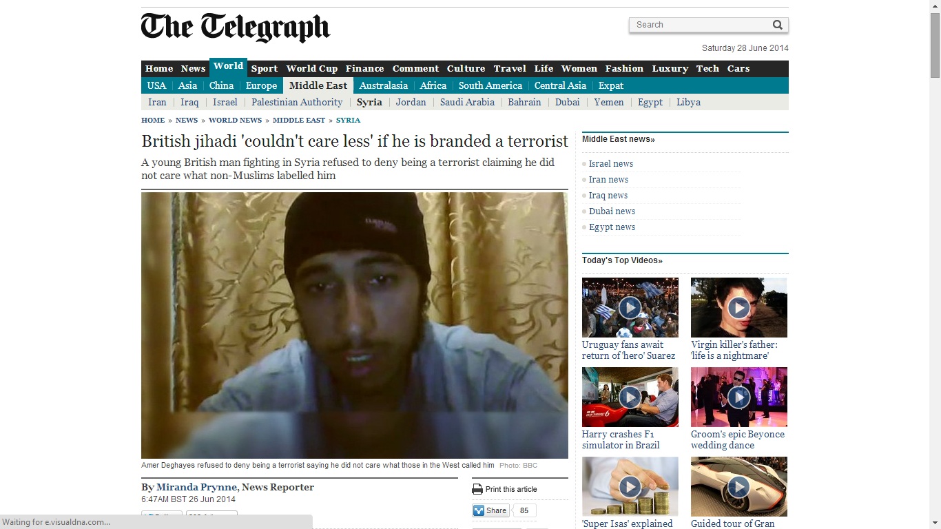 به گزارش شهدای ایران به نقل از از دیلی تلگراف: شبکه بی بی سی انگلیسی به تازگی مصاحبه را با یکی از تروریست های سوری انجام داده است که تابعیت انگلیسی دارد. «امیر دقایه» بیست ساله به همراه برادر 16 ساله خود چند ماه پیش به سوریه مسافرت کردند. پس از مدتی برادر دیگر آنها نیز به آنان ملحق شد که چندی بعد در درگیری کشته شد. امیر نیز در همان درگیری مورد اصابت گلوگه قرار گرفت.