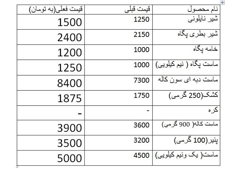 گزارش میدانی خبرنگار ما حاکی از آن است که حدود 10 روز گذشته بهای برخی از فراورده های لبنی نزدیک به 20 درصد افزایش داشته است و همانگونه که در جدول زیر مشاهده می شود تنها قیمت کره بدون تغییر مانده که آن هم به گفته مغازه داران خرید گذشته بوده است. همچنین فروشندگان از میزان افزایش قیمت این کالا اظهار بی اطلاعی کردند.
