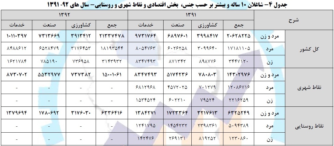 همچنین عنوان شده است تعداد کل مردان شاغل کشور از 17 میلیون و 181 هزار و 105 نفر در سال 91 به 18 میلیون و 193 هزار و 544 نفر در سال 92 افزایش یافته است. از سویی تعداد جمعیت زنان شاغل نیز از 3 میلیون و 447 هزار و 120 نفر به 3 میلیون و 143 هزار و 932 نفر رسیده که البته در این بخش کاهش گزارش شده است.