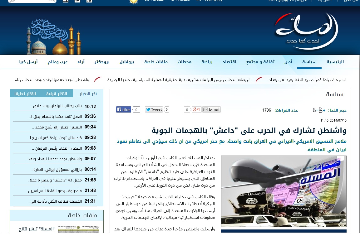 به گزارش شهدای ایران به نقل از جام نیوز، پایگاه خبری المسله اعلام کرد: ماه گذشته آمریکا صد ها تن از کارشناسان نظامی خود را در بغداد مستقر می کند تا در کنار ارتش عراق از پیشروی های داعش در مناطق شمالی جلوگیری کند. به دنبال این اقدام ایالات متحده آمریکا هواپیماهای بدون سرنشین را بر فراز آسمان بغداد و موصل به پرواز در می آورد تا پایگاه های نظامی تروریست های داعش را شناسایی کرده و از میزان قدرت دفاعی این گروهک اطلاعات بدست آورند.