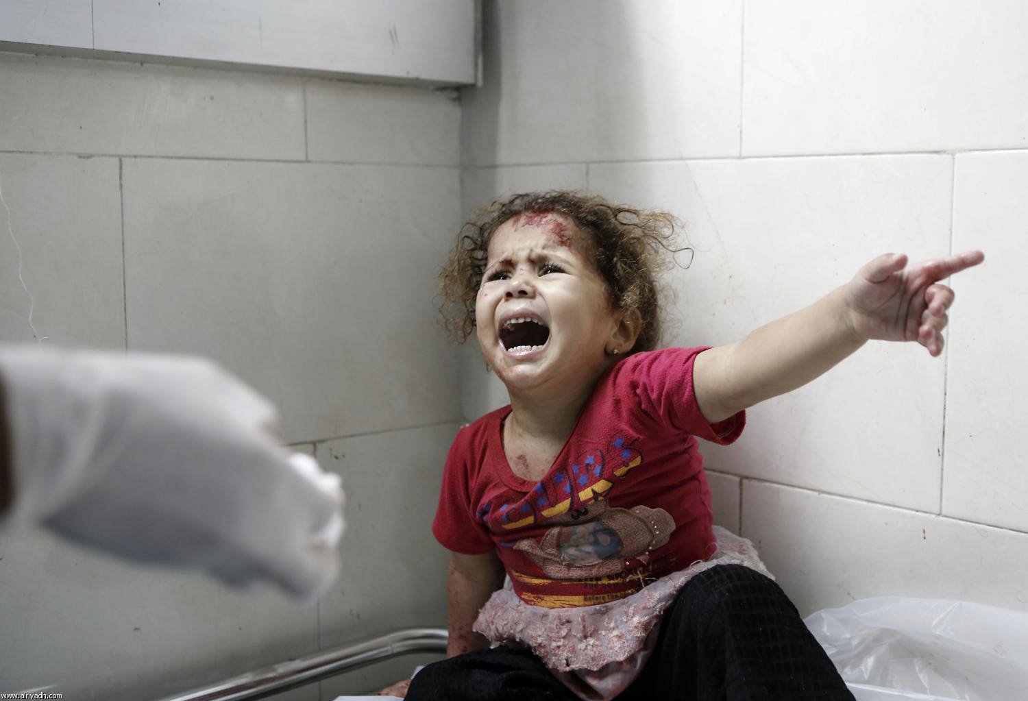 در تصویر یک دختر خردسال فلسطینی دیده می شود که در بیمارستان نزدیک منطقه الشجاعیه ناله سر داده است. گفته می شود منزل این دختر خردسال فلسطینی در حالی که به همراه خانواده اش در منطقه الشجاعیه حضور داشته هدف بمباران جنگنده های صهیونیستی قرار می گیرد و وی بسیاری از نزدیکانش را از دست می دهد.