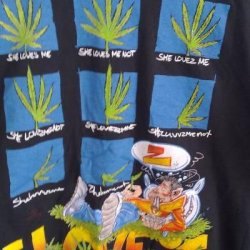 برای مثال طرح یکی از این تی شرت ها و نوشته آن به این شرح است: فردی که به هر دلیلی عشقش برباد رفته لمـ داده رو کوهی از ماری جوانا و ماری جوانا میکشد بعد قسمت اول میکشد و برگ ماری جوانا رو میکشد و پیش خودش میگوید She Loves Me (دوستمـ داره)بعد برگ بعدی را میکشد و میگوید She Loves Me Not (دوستمـ نداره)همینجوری میکشد و کمـ کمـ نوشته ها تبدیل به یک خط میشوند و به فضا می رود.
