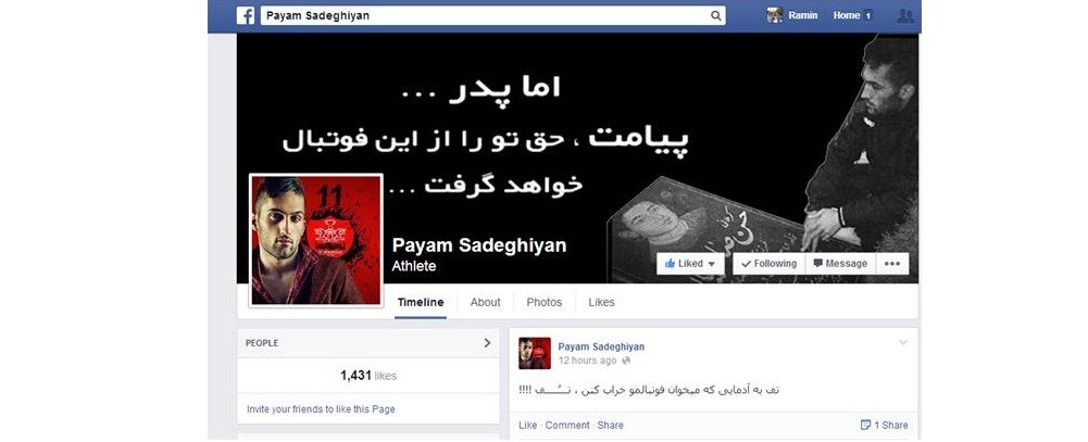 شهدای ایران ، در حالی که کمتر از 14 ساعت از ابلاغ حکم جنجالی پیام صادقیان می گذرد این بازیکن در صفحه فیسبوک خود این مطلب را قرار داد: تف به آدمایی که میخوان فوتبالمو خراب کنن. تف!!!!!