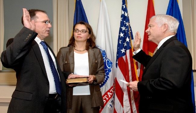 گفتنی است، تصویر بالا سوگند وفاداري مايكل ويكرز (چپ) براي پذيرش منصب "مشاور ارشد" وزير جنگ آمريكا - اكتبر 2008میباشد.
