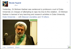 به گزارش شهدای ایران، به نقل از صلح نیوز، نیکولا فایارد، دانشجوی دانشگاه دوک امریکا که پیش ار این از تمایلات شیطانی محسن کدیور برای تجاوز جنسی به خود پس از کلاس درس خبر داده بود ، در صفحه فیسبوک خود نوشته است: