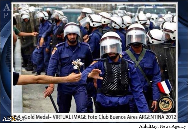 در این عکس که آشکارا بیانگر مسالمت آمیز بودن تظاهرات و اعتراضهای مردم بحرین است؛ یکی از شهروندان بحرینی به نیروهای امنیتی گل تقدیم میکند، ولی نیروی امنیتی رژیم آل خلیفه دست آن شهروند را پس میزند.