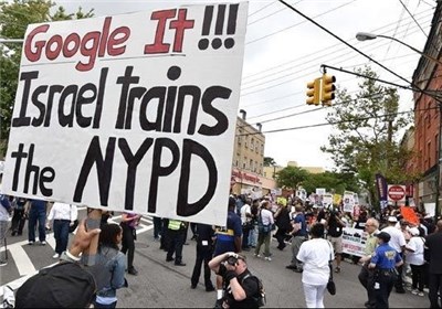 یکی از شهروندان نیویورکی در تظاهرات روز شنبه پلاکاردی را حمل می کرد که روی آن نوشته شده بود: "این مسأله را در گوگل جستجو کنید ... اسرائیل پلیس نیویورک را آموزش می دهد".