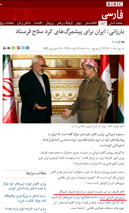 به گزارش شهدای ایران، "محمد جواد ظریف" وزیر امور خارجه کشورمان در نشست خبری مشترک با "مسعود بارزانی" رئیس اقلیم کردستان عراق، در اربیل عراق در پاسخ به سوال خبرنگار "بیبیسی فارسی" (BBCPersian) درباره دامنه همکاری ایران با نیروهای کرد تایید کرد که ایران هم با دولت عراق و هم با دولت اقلیم کردستان "در حوزههای مختلف همکاری نظامی" داشته است.