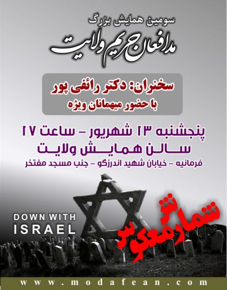 سومین همایش بزرگ مدافعان حریم ولایت با عنوان شمارش معکوس و با موضوع ضد صهیونیسم روز پنجشنبه 13 شهریورماه از ساعت 17 الی 19 برگزار می گردد.