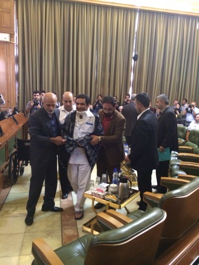 علی صابری دیگر عضو شورای شهر تهران نیز که به دلیل تصادف در شب گذشته از ناحیه گردن دچار آسیب شده بود، دقایقی پیش با کمک پزشکان در شورا حاضر شد.
