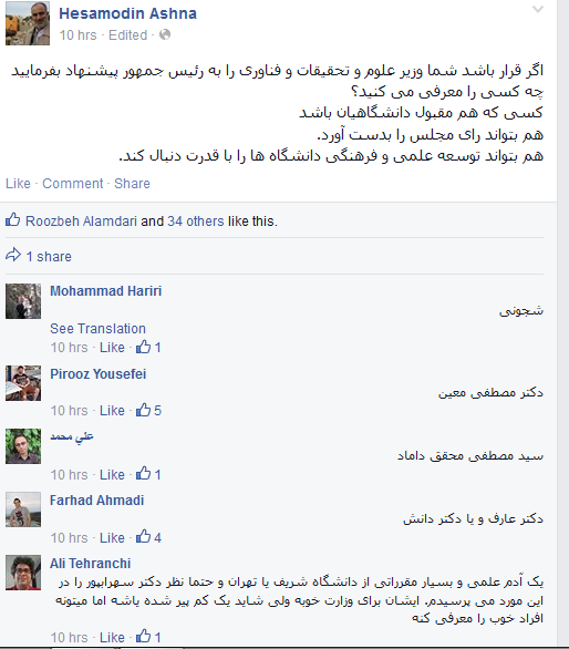 حسام الدین آشنا در صفحه خود در فیس بوک نوشته است:"اگر قرار باشد شما وزیر علوم و تحقیقات و فناوری را به رئیس جمهور پیشنهاد بفرمایید چه کسی را معرفی می کنید؟ کسی که هم مقبول دانشگاهیان باشد.هم بتواند رای مجلس را بدست آورد.هم بتواند توسعه علمی و فرهنگی دانشگاه ها را با قدرت دنبال کند."