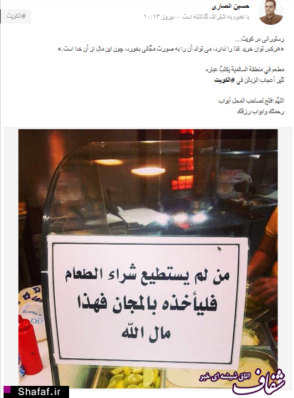 به گزارش شهدای ایران به نقل از شفاف، یک کاربر شبکه اجتماعی با به اشتراک گذاشتن تصویری در گوگل پلاس خود نوشت:«هرکس توان خرید غذا را ندارد، می تواند آن را به صورت مجانی بخورد، چون این مال از آن خدا است.