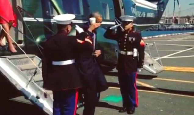 زمانی که اوباما حوالی ظهر به وقت نیویورک از هلی‌کوپترش خارج شد، با احترام نظامی دو افسر نیروی دریایی روبه رو شد و وظیفه داشت که به عنوان فرمانده کل قوا، به احترام آنها پاسخ نظامی دهد اما وی در حالی که یک لیوان سفید رنگ چای در دست داشت، دست خود را به نشانه احترام در کنار سر خود قرار داد.