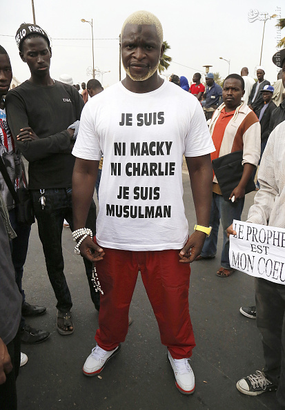 نوشته روی پیراهن یکی از معترضان سنگالی علیه اهانت هفته نامه چارلی ابدو فرانسه به پیامبر اسلام: من نه چارلی هستم نه مایکی، من یک مسلمانم.