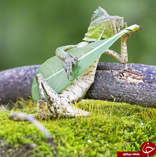 عکاسی در اندونزی از ژست یک مارمولک که گویی با برگ در حال گیتار زدن است تصویری جالب را به ثبت رسانده است.