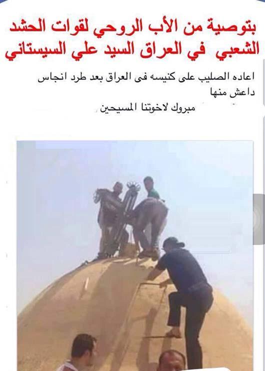* با توصیه آیت الله سیستانی، مرجع تقلید نیروهای بسیج مردمی عراق، پس از بیرون راندن داعشی های کثیف، صلیب به کلیسای مسیحیان عراق بازگردانده شد. تبریک به برادران مسیحی.