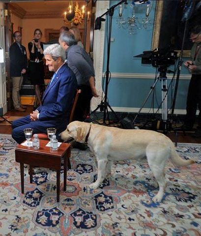 جان کری وزیر خارجه آمریکا در کنار سگش "بن” به هنگام آماده شدن برای انجام مصاحبه تلویزیونی در محل وزارت خارجه آمریکا در واشنگتن.