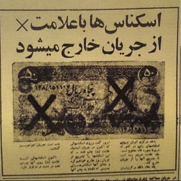 شهدای ایران:در خبر منتشره روزنامه کیهان به نقل از یک مقام مسئول در بانک مرکزی نوشته شده بود: روی اسکناسهایی که اکنون در جریان است یک علامت (×) چاپ شده که این اسکناسها را به تدریج از جریان خارج خواهیم کرد.