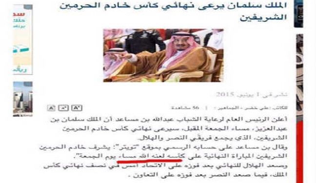 هکرها در لابلای یک خبر ورزشی که به نقل از عبدالله بن مساعد ریيس كل اداره امور جوانان عربستان نوشته شده این جمله را افزودند: "خادم حرمين شریفين جمعه شب نظاره گر مسابقه نهايي جام خود است، لعنت خدا بر او باد".