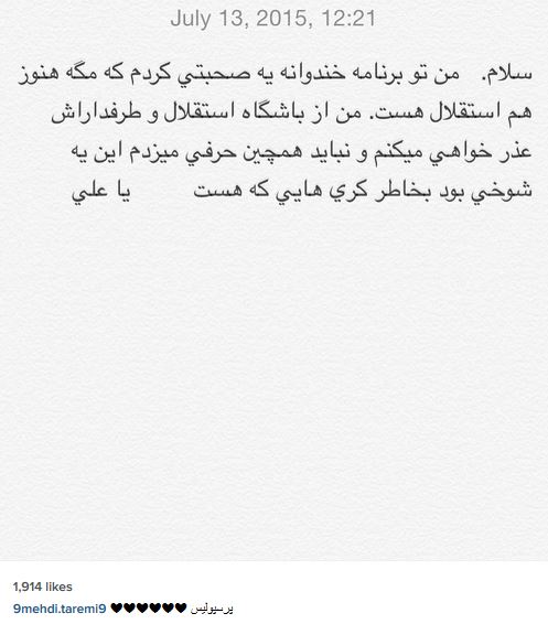 شهدای ایران:مهدی طارمی مهاجم تیم پرسپولیس که مهمان برنامه خندوانه بوده، از باشگاه و هواداران استقلال عذرخواهی کرده است.*جام نیوز