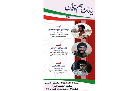 گرامیداشت یاد و نام شهیدان سید اکبر میرمحمدی، قدرت الله بداغی و علی افغانی با عنوان "یاران هم پیمان" روز جمعه 15 آبان در گلزار شهدای بهشت زهرا(س)برگزار می شود.