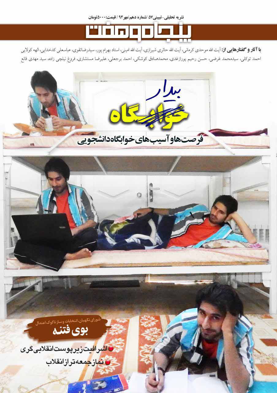 نشریه تحلیلی – تبیینی « پنجاه و هفت » از محصولات مرکز رسانه ای ۵۷ قرارگاه شهید باقری سازمان بسیج دانشجویی به مدیرمسئولی محمدسعید سرافراز و سردبیری محمدحسن صادق پور است و شماره دهم آن در ۹۶ صفحه منتشر شده است. علاقه مندان به تهیه این نشریه به منظور دریافت اشتراک می توانند و یا دریافت فایل پی دی اف به سایت نشریه به آدرس http://q-b.ir/content/۲۵۸۳ مراجعه نمایند.