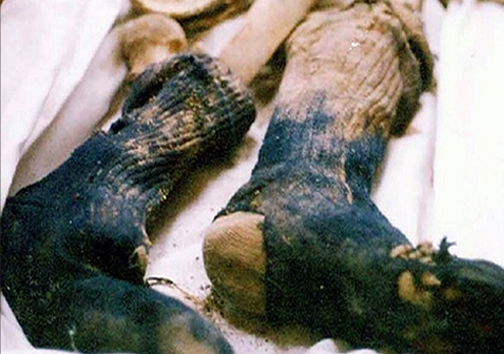 «وقتی تابوت را باز کردم در کمال تعجب دیدم پای راست او که در جوراب بوده، از زانو به پایین کاملا سالم مانده بود و حتی انگشت کوچک پای او که از سوراخ جوراب بیرون مانده بود، استخوان شده بود! آن روز این عکس را گرفتم تا برای خودم حجت باشد که شهدا کیستند و چیستند!»