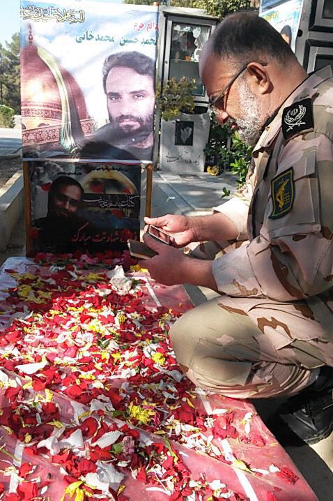 تصویر زیر مربوط به حضور سردار سعید قاسمی با لباس نظامی قبل از عزیمت به سمت نجف اشرف بر سر مزار شهدای مدافع حرم است.